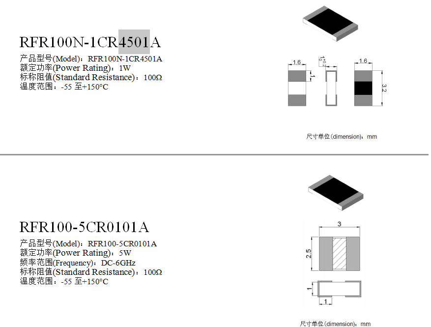 Chip Resistors 50Ω 100Ω 1w 5w BeO AlN Al2O3 1.6*3.2 2.5*3